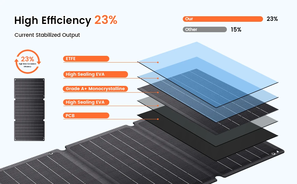 23% high conversion efficiency, thanks to premium Grade A+ Monocrystalline cells.