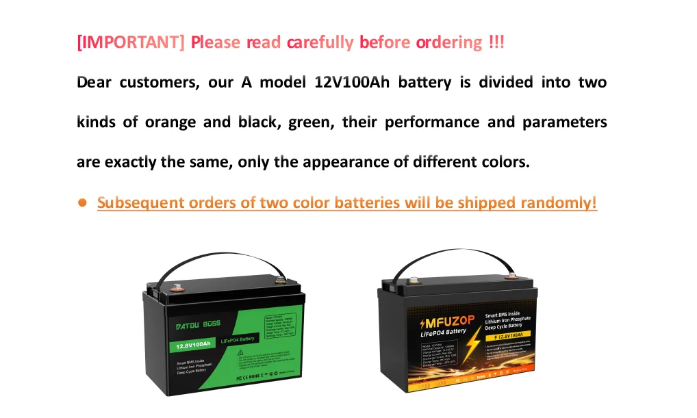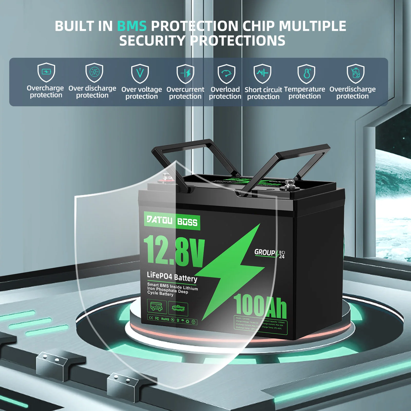 12.8V 100Ah battery built-in upgarded 100A BMS (Battery Management System) to protect it from overcharge, over-discharge, over-current, and short circuit with excellent self-discharge rate. Built-in high-temp/ low-tem cut off prevents charging/ discharging When the temperature reaches a certain threshold value.