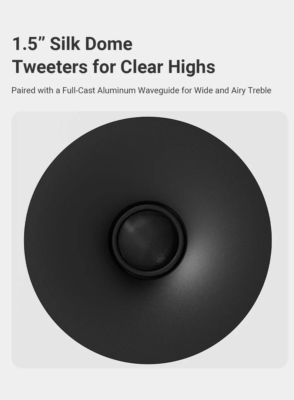·Woofer Size and Material:1.5-inch (40mm) 25-Core Silk Dome Tweeter