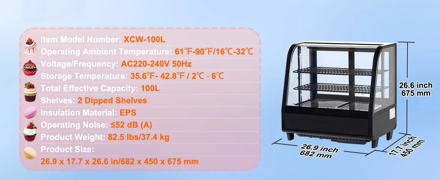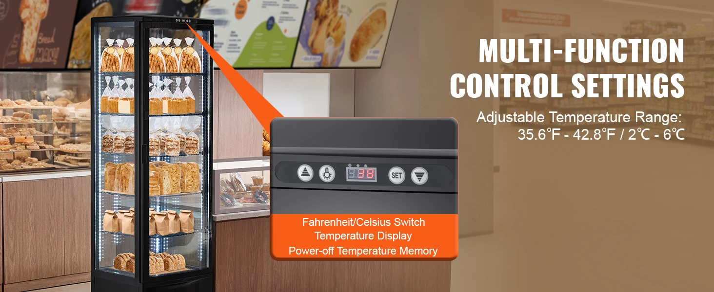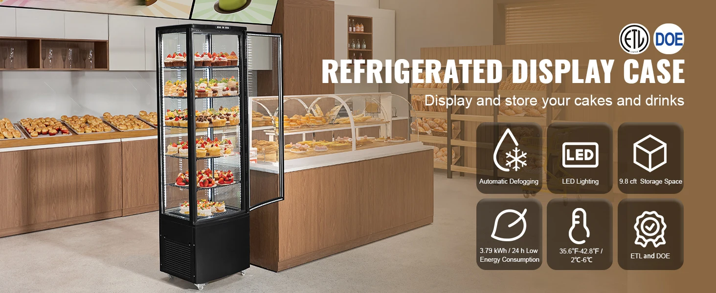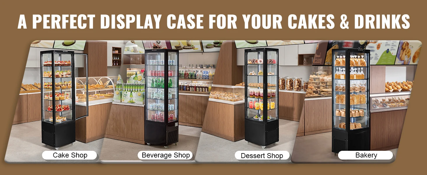 Its design is sleek and can fit easily into different corners, making it suitable for bakeries, pastry shops, beverage stores, and dessert shops.