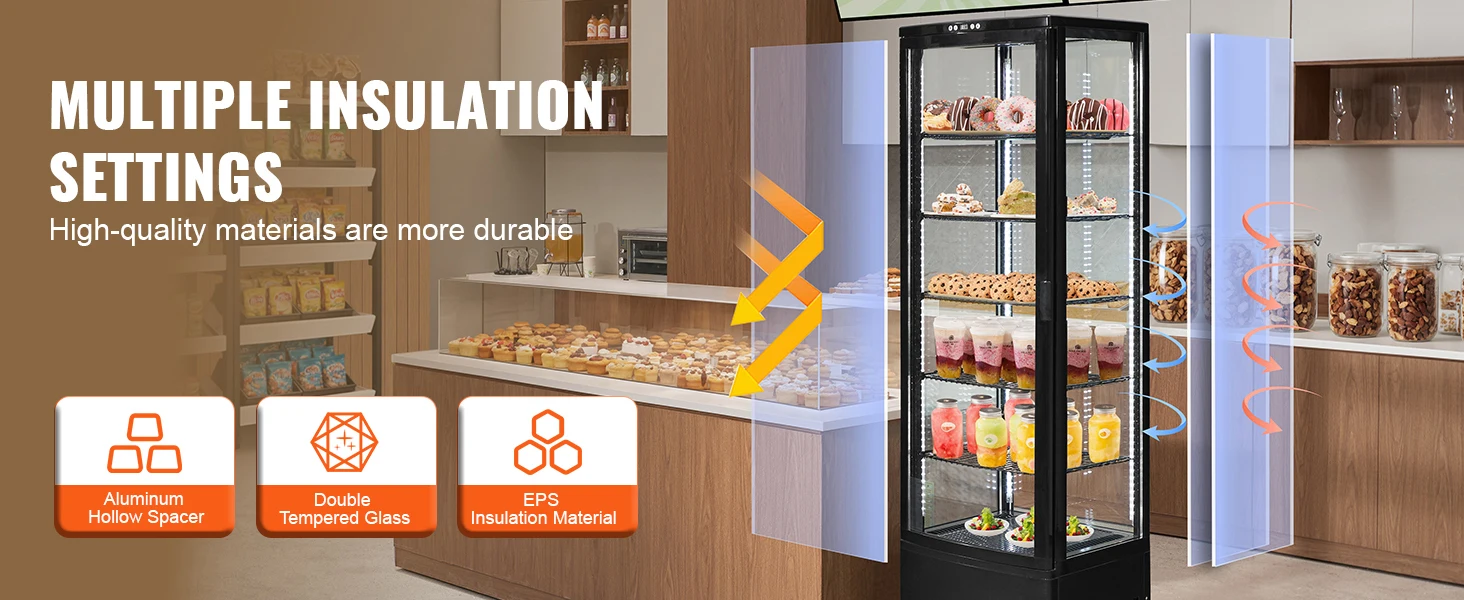 High-Quality Construction: The upgraded display case uses double-layer 4mm tempered glass, 8.5mm aluminum spacer bars, and EPS insulation. With closed cabinet doors, it ensures airtight insulation, boosts efficiency, and saves energy.