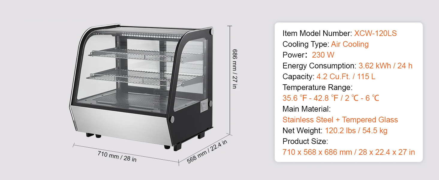 Quick Cooling: The refrigerated display case has a Turbo fan cooling system. It rapidly cools to the set temperature (35.6-42.8°F / 2-6°C), is energy-efficient at 3.79 kW.h/24h, and keeps food in top condition.